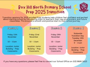 Our Prep Transition program has now completed. For all Prep enquiries, please contact our school office on 03 9890 5023 or email box.hill.north.ps@education.vic.gov.au